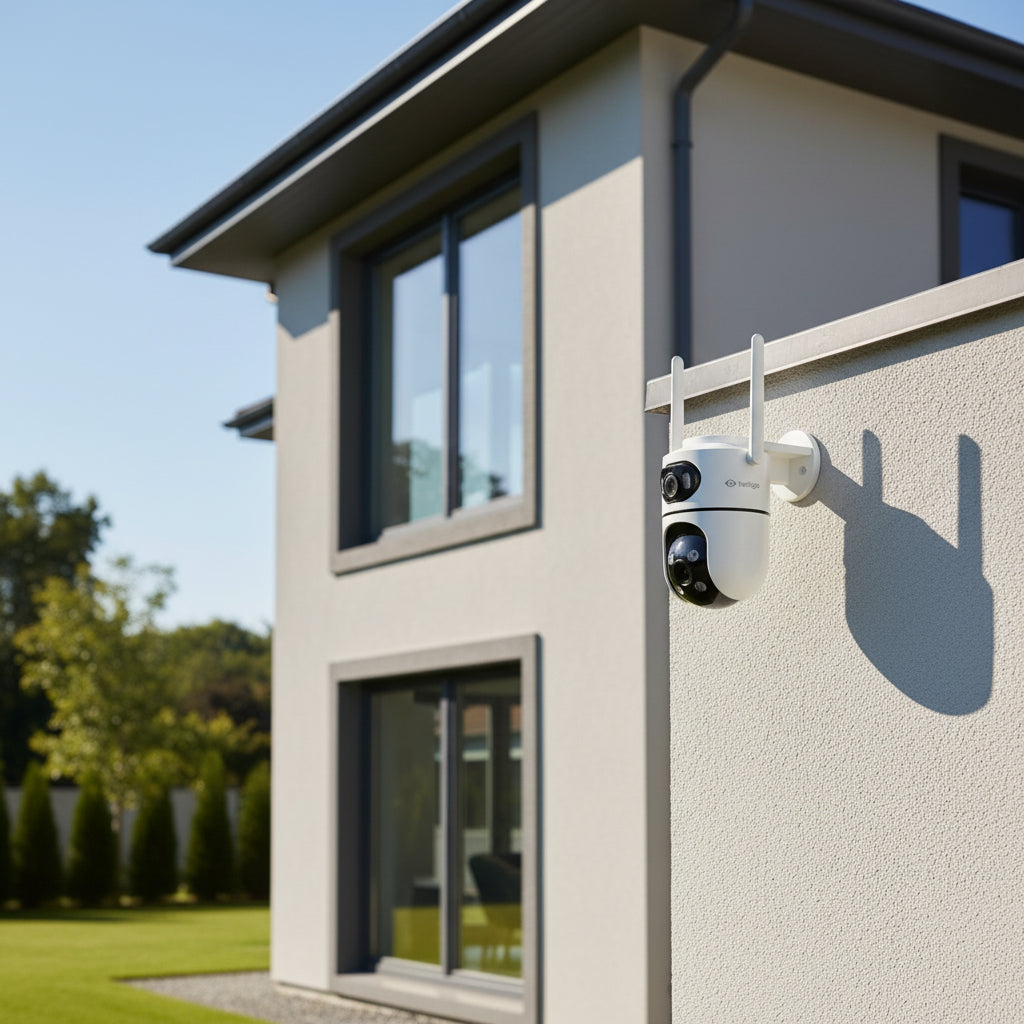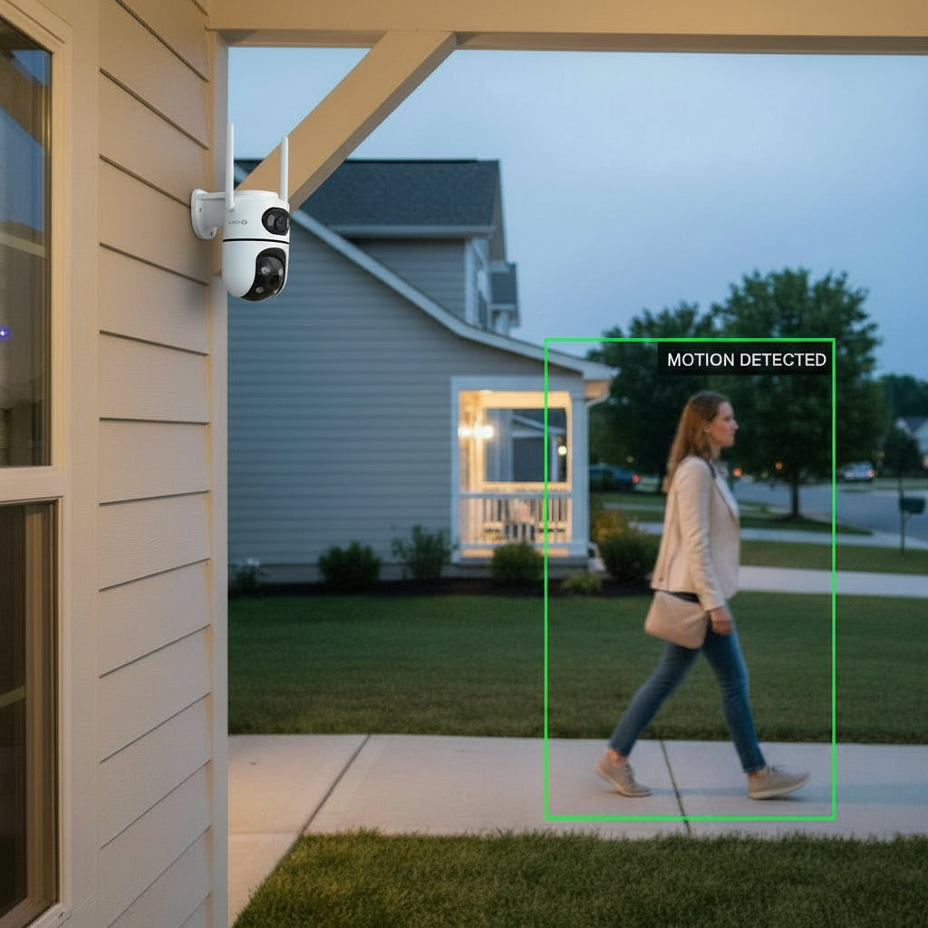 Cámara con doble lente, diseñada para uso exterior (IP66), con sensor de imagen CMOS, que garantiza un procesamiento óptimo de la imagen frente a cambios de luz y sombras. Cuenta con función de alerta de movimiento. Funciona conectada a una red WiFi y la podés ver en el celular, tablet o PC.